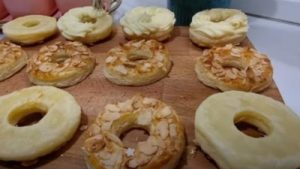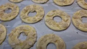 Wlać mieszaninę do rondla i gotować na małym ogniu, aż zgęstnieje. Następnie natychmiast zdejmij garnek z ognia. Dodać masło i dokładnie wymieszać. Przykryj mieszaninę folią spożywczą i pozostaw do ostygnięcia. Na wierzchu ułóż ciasto francuskie, wytnij z niego kółka i wytnij w nich okrągły środek. Następnie przekładamy je na blachę wyłożoną papierem do pieczenia i smarujemy roztrzepanym jajkiem. Posyp krążki płatkami migdałów, następnie włóż blaszkę do piekarnika nagrzanego do 180°C i piecz przez około 15-20 minut na złoty kolor.