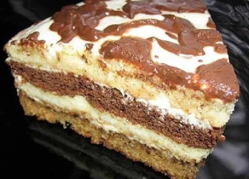 Teraz na przemian układaj upieczone ciasta i przekładaj je przygotowanym kremem. Udekoruj według gustu np. startą czekoladą lub polewą czekoladową i włóż na 3-4 godziny do lodówki.