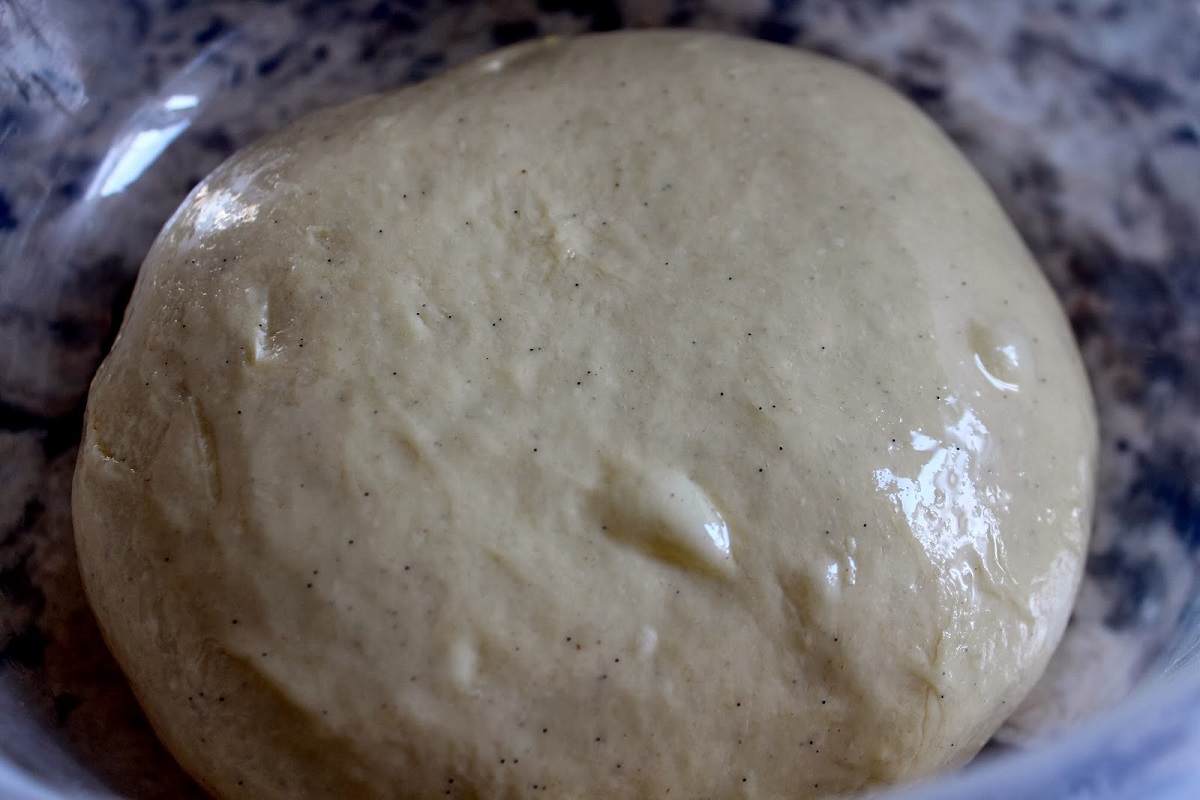 Kiedy okaże się, że są grudki, dodaj kolejne 20 ml oleju roślinnego. Wyrabiaj ciasto jeszcze przez około 10 minut. Powinno być miękkie i lekko lepić się do stołu. Ciasto przełożyć do miski, przykryć folią spożywczą i pozostawić w ciepłym miejscu na 40 minut.