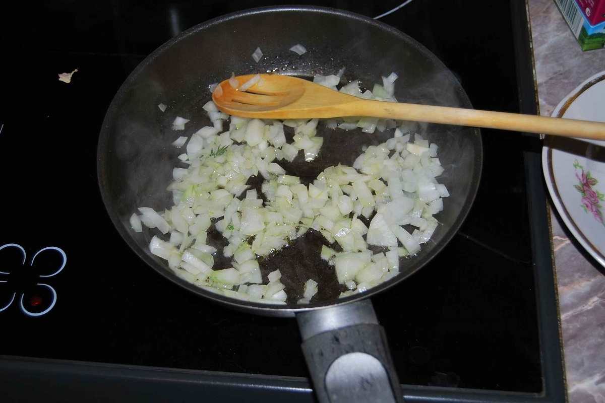 Czas zrobić farsz. Cebulę obrać i posiekać, podsmażyć na patelni rozgrzanej masłem do miękkości.