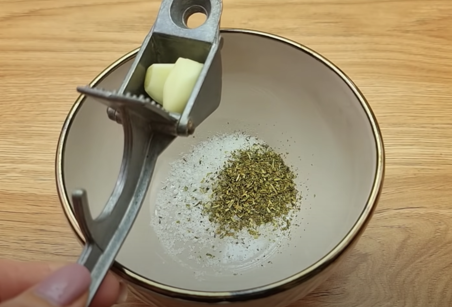 Czosnek drobno posiekaj lub przeciśnij przez praskę. Dodaj do niego sól, olej oraz pozostałe zioła i pieprz. Sporządzonym sosem polej zawartość blaszki i dokładnie wymieszaj.