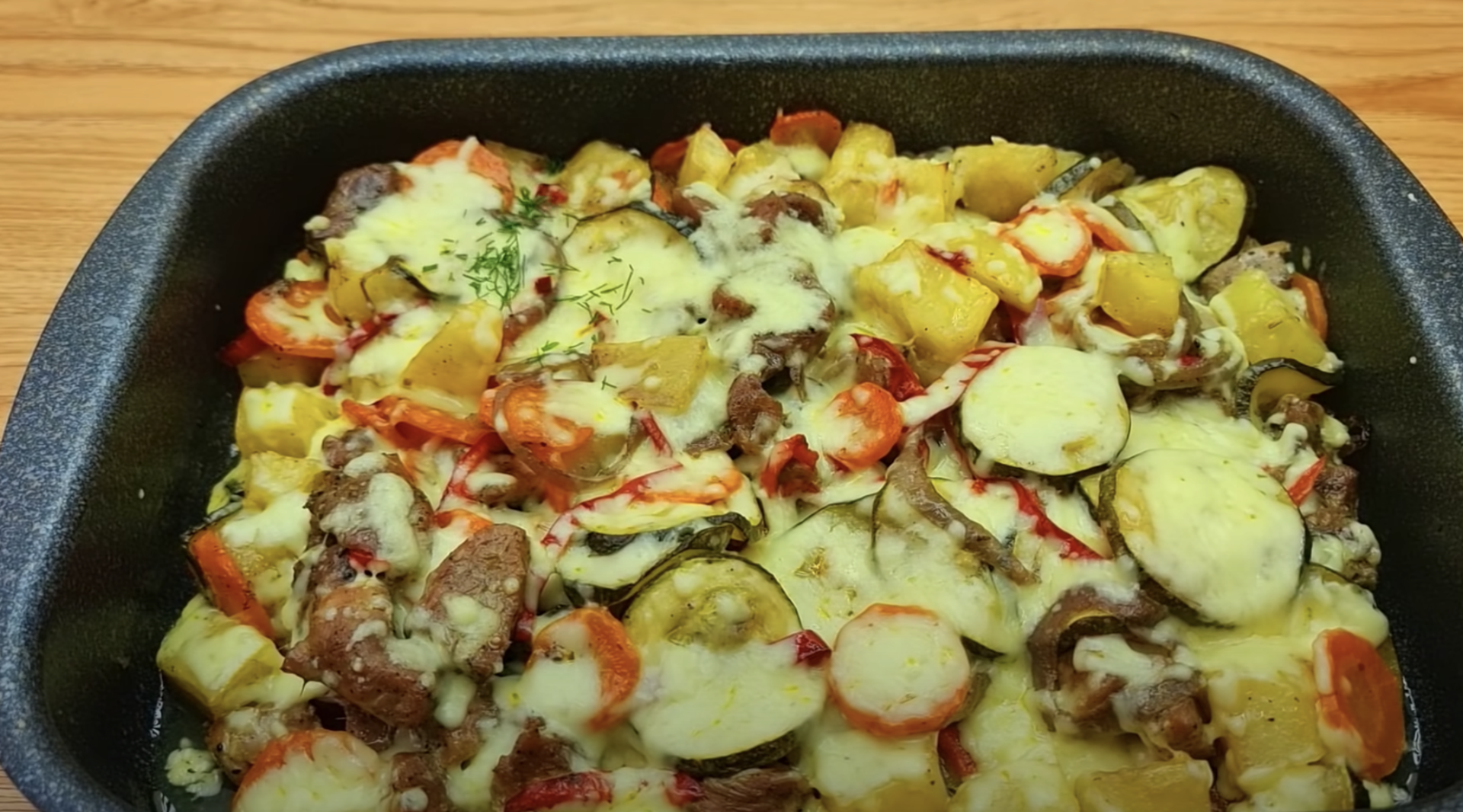 Blachę najpierw przykryj zwilżonym papierem do pieczenia następnie folią aluminiową. Włóż ją do nagrzanego do 180° C piekarnika i piecz przez 1 godzinę. Po upływie tego czasu odsłoń papier i folię i posyp danie startym serem. Zapiekaj kolejne 10 minut. Na talerzu danie posyp posiekanym koperkiem.