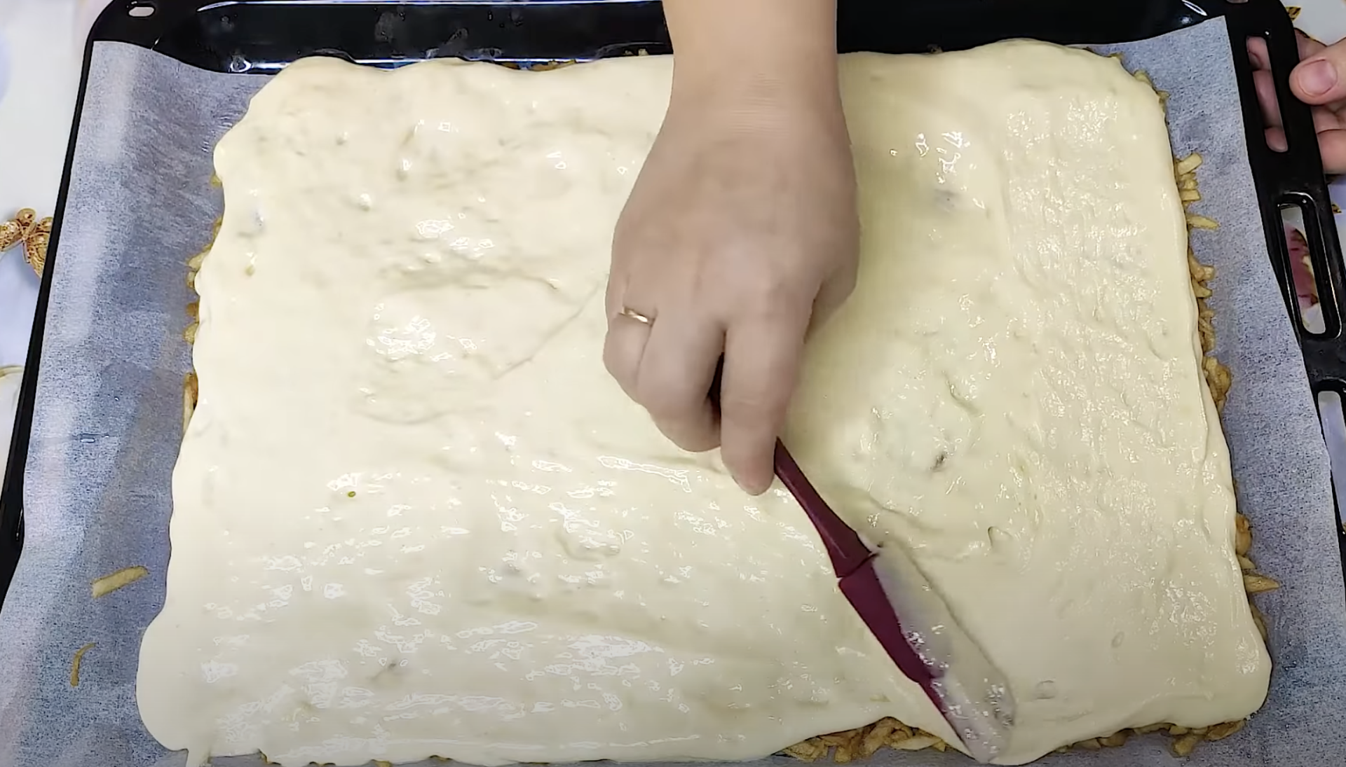 Następnie obróć (za pomocą np deski, lub papieru do pieczenia) i delikatnie zdejmij papier do pieczenia od strony jabłek.