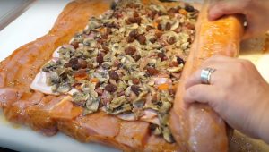 Na schabie ułóż plastry boczku, a następnie wyłóż farsz.