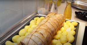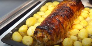 Posmaruj roladę marynatą, a ziemniaki polej oliwą, winem i wodą. Piecz przez 40 minut w piekarniku rozgrzanym do 200°C.