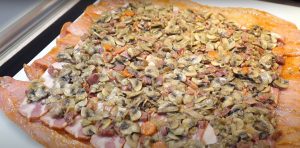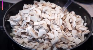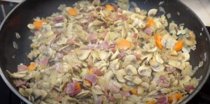 Przygotuj farsz: usmaż pokrojone warzywa, takie jak czosnek, cebulę, pieczarki i marchew.