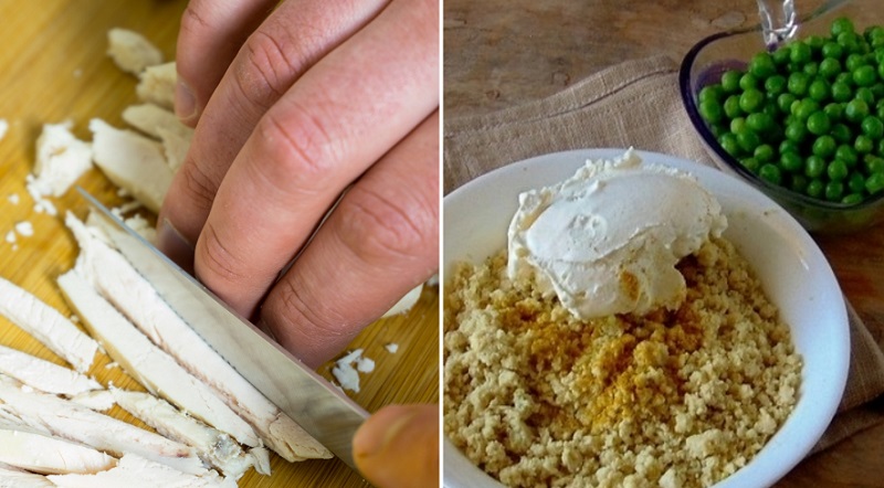 Ugotowany filet z kurczaka posiekaj, dodaj przyprawy, ser śmietankowy i ugotowany groszek. Groszek możesz pozostawić w całości lub możesz posiekać go razem z mięsem. Dokładnie wymieszaj uzyskaną masę – to podstawa przyszłej rolady.