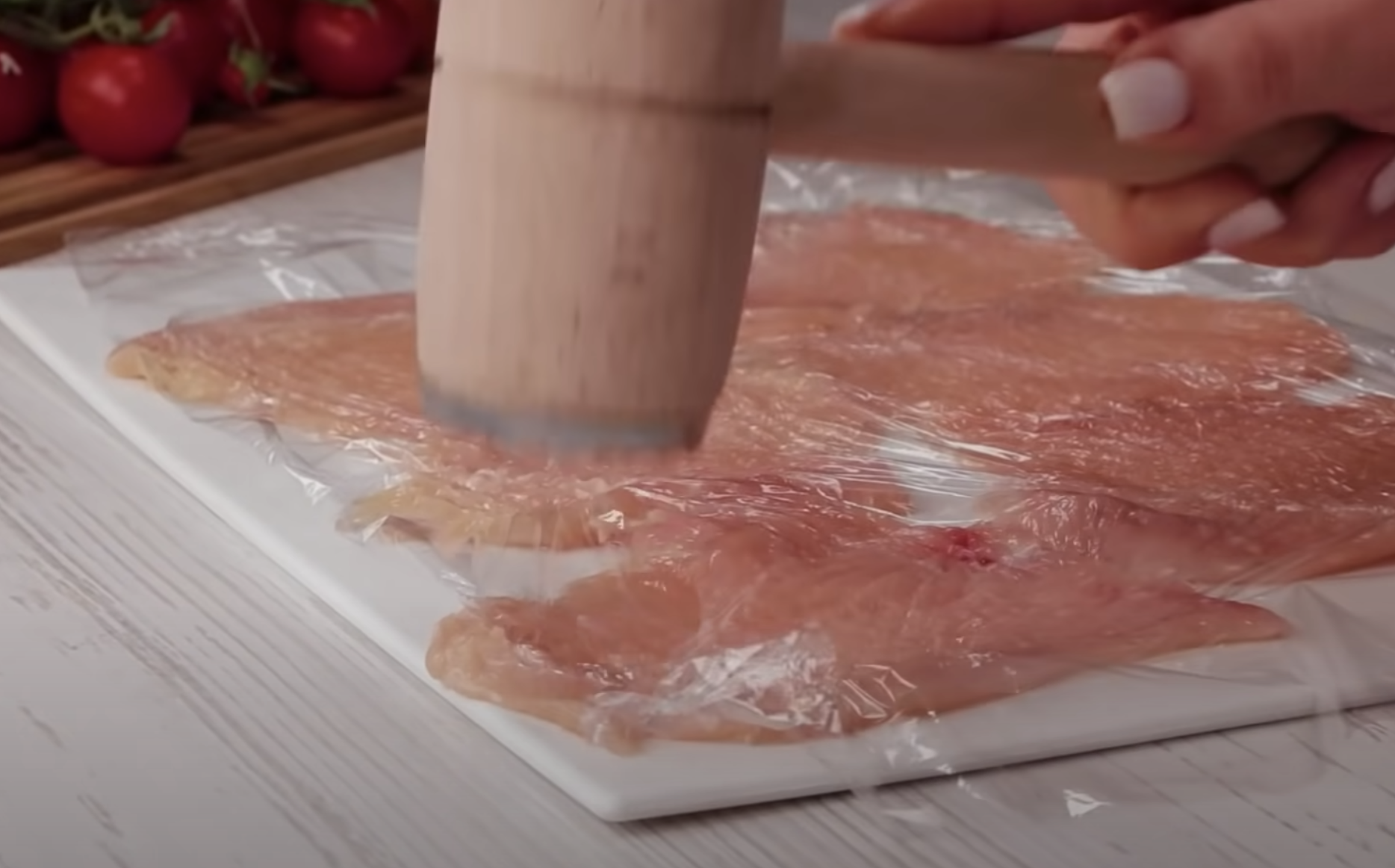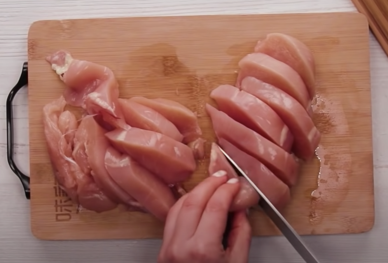 Pierś z kurczaka umyj, osusz i przekrój na pół. Pokrój każdą połówkę w paski.