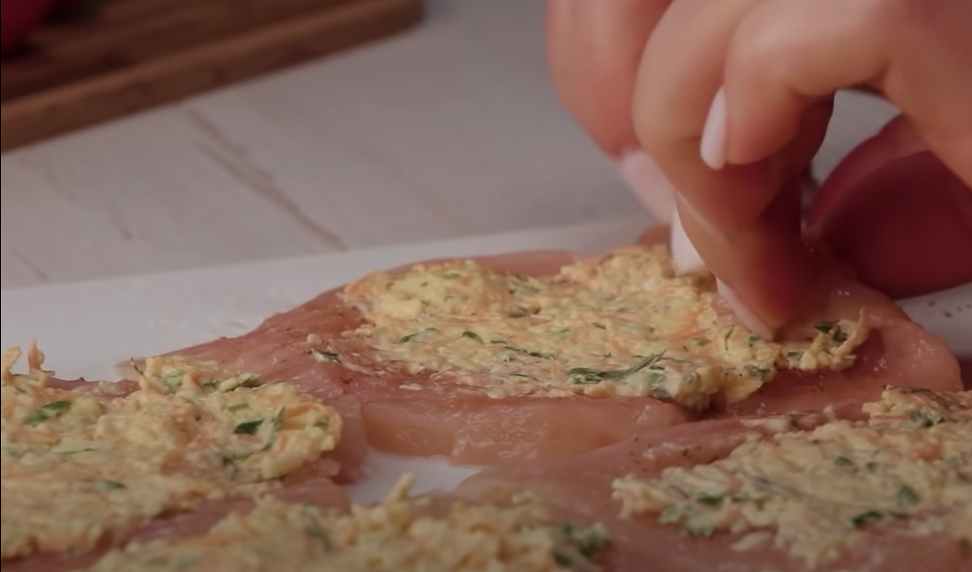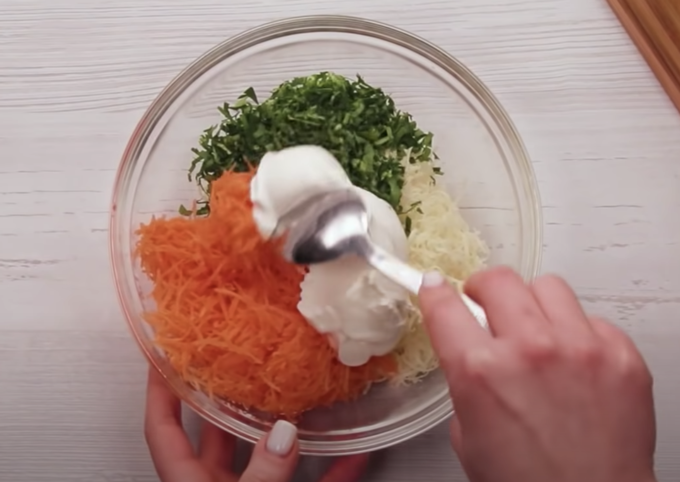 Aby zrobić nadzienie wymieszaj startą marchewkę, drobno posiekaną pietruszkę, oba sery i wymieszaj na gładką masę.