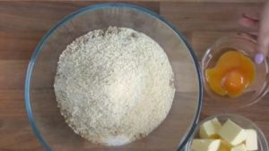 W dużej misce wymieszaj przesianą mąkę ze szczyptą soli, cukrem oraz drobno zmielonymi orzechami włoskimi i migdałami. Wszystkie sypkie składniki dokładnie wymieszaj.