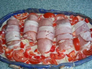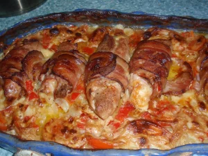Możesz użyć mięsa drobiowego lub wieprzowego. Ten przepis dotyczy faszerowanych klopsików zawiniętych w boczek. Zapiekane są razem z warzywami, dzięki czemu mają wspaniały smak, a mięso jest cudownie soczyste.