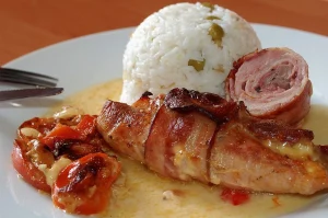 Rozbij plastry mięsa, posól je i pieprz. Na każdym kawałku połóż plaster szynki i dwa plastry sera. Zroluj ciasno roladki, owiń je plasterkiem boczku i umieść w wysmarowanej tłuszczem blaszce. Cebulę obrać i pokroić w talarki. Czosnek również obieramy i kroimy w plasterki. Pokrój paprykę i pomidory na 8 części.