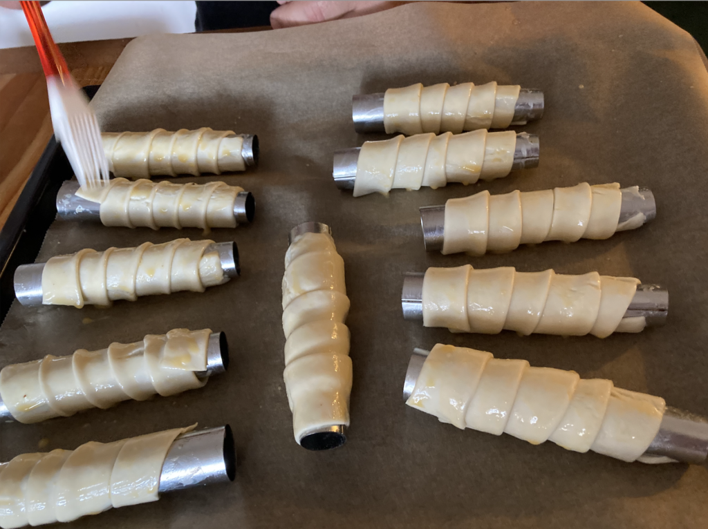 Posmaruj rurki roztrzepanym jajkiem, a następnie piecz w rozgrzanym piekarniku przez 12-15 minut (w zależności od wielkości rurki), aż nabiorą złotego koloru. Pozostaw do ostygnięcia. Rurki są kruche – ostrożnie zdejmij je z rurek.