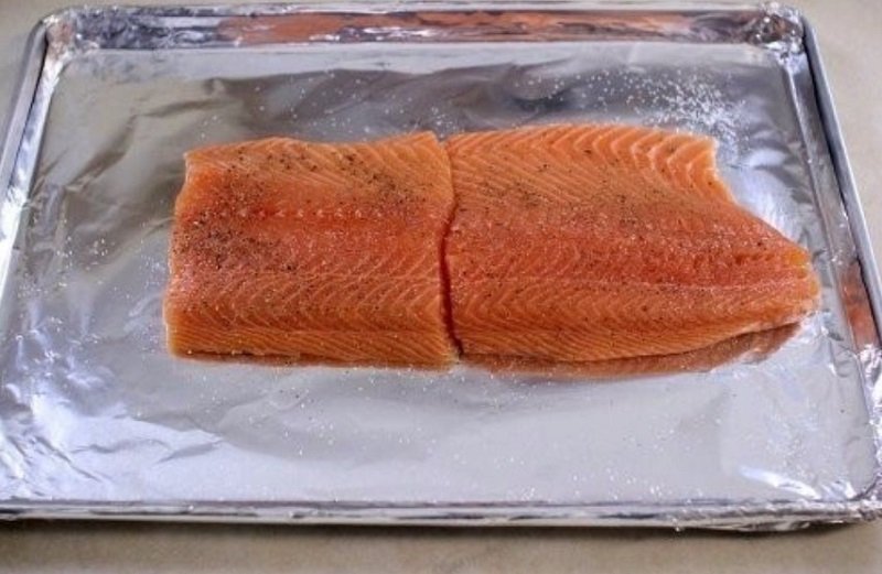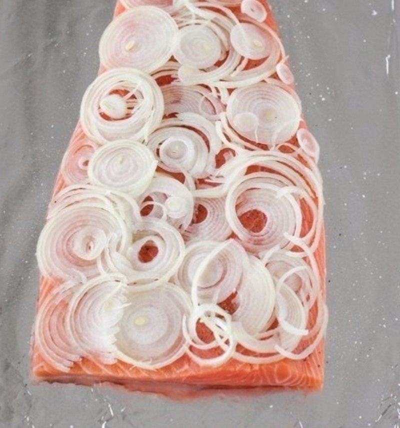 Kolejnym krokiem jest obranie cebuli i pociachanie jej na cieniutkie plastry. Powinna ona zostać rozłożona na całej powierzchni łososia.