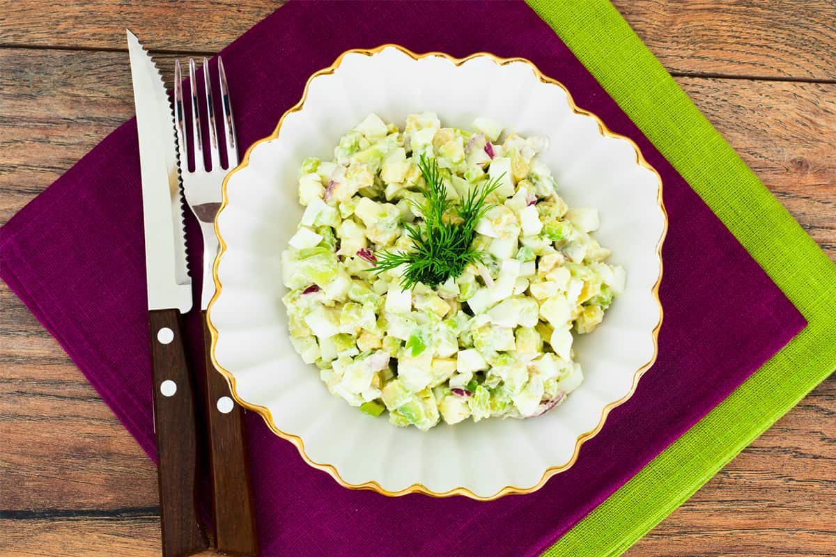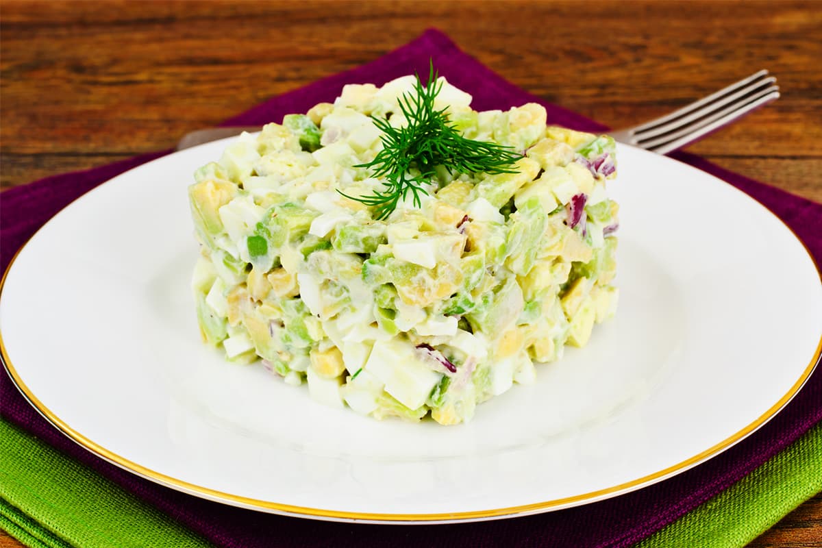 Pokroić cebulę w drobną kosteczkę. Wszystkie składniki umieścić w misce. Dodać groszek konserwowy i majonez, a następnie dokładnie wymieszać. Na koniec doprawić solą i pieprzem do smaku.