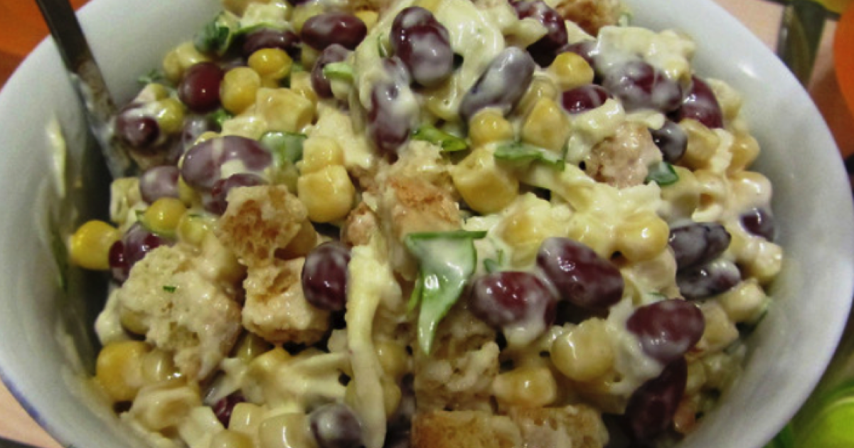 Otwórz puszki i odlej z nich zalewę. Następnie kukurydzę i fasolę umieść w dużej misce. Zetrzyj lub bardzo drobno pokrój jajka. Dodaj posiekany czosnek – ząbek (lub więcej, w zależności od oczekiwanego stopnia ostrości). Dodaj składniki do miski z warzywami.