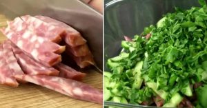 Przede wszystkim ugotuj jajka na twardo. Aby żółtko było wystarczająco twarde, zaleca się gotowanie ich przez około 7 do 10 minut. Podczas gdy jajka się gotują, umyj ogórek, zieloną cebulę i pietruszkę i wszystko dobrze osusz papierowym ręcznikiem. Ogórka pokrój w długie paski i w ten sam sposób pokrój wędzoną kiełbasę. Wsyp oba do dużej salaterki.