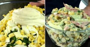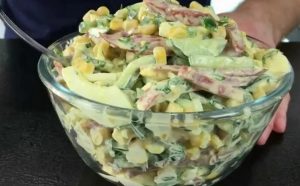 W tym czasie jajka powinny być gotowe. Odcedzamy z nich wodę i odstawiamy do ostygnięcia. Zieloną cebulę i pietruszkę posiekać nożem na mniejsze kawałki i wrzucić do salaterki z kiełbaskami i ogórkiem. Wysterylizowaną kukurydzę odsączyć z lakieru i dodać do pozostałych składników.