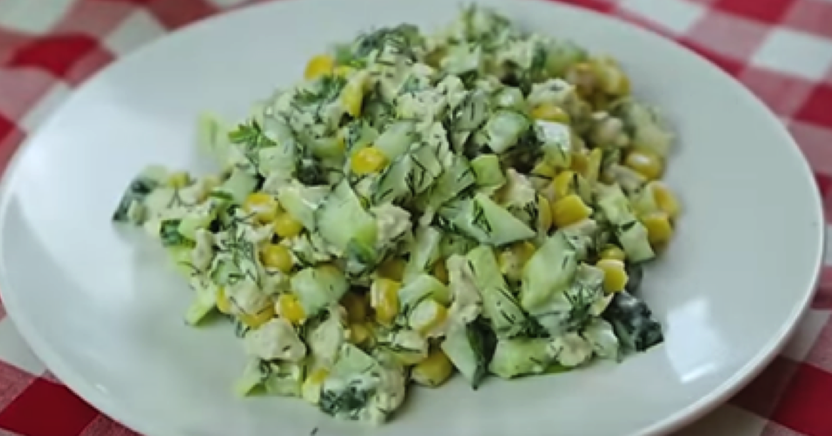 Umyj i oczyść pierś z kurczaka. Po doprawieniu jej solą i pieprzem włóż na pół godziny do piekarnika. Najlepiej w rękawie do pieczenia, a piekarnik nastaw na 180 stopni. Ogórek zielony obierz ze skórki i pokrój w kostkę, dodaj posiekany koperek, kukurydzę.