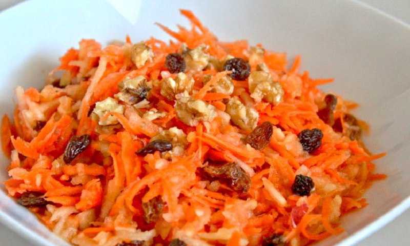 Rodzynki zalewamy gorącą wodą i odstawiamy na ok. 5-10 minut. Marchew ścieramy na drobnych oczkach tarki. Przygotowujemy sos. Mieszamy miód, sok z cytryny, cynamon i jogurt naturalny. Dodajemy do rodzynek i marchewki.