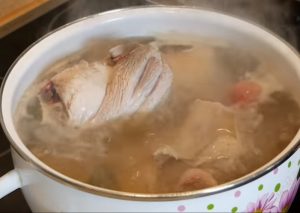 Następnie przykryć pokrywką i doprowadzić do wrzenia. Po zmniejszeniu temperatury, usuwać pianę łyżką, posolić i gotować przez 3-4 godziny, przykrywając pokrywką, ale nie szczelnie. Co godzinę obracać mięso w garnku, aby równomiernie się ugotowało. Wyjąć ugotowane mięso z garnka i pozwolić mu ostygnąć.