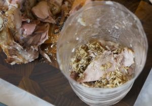Następnie ręcznie rozdzielić na duże części, oczyszczając z kości itp. Drobno zetrzeć czosnek, dodać zmielony pieprz i wymieszać. Plastikową butelkę odciąć u góry i wkładać do niej kawałki mięsa naprzemiennie z czosnkiem. Wlać 200-250 ml wody pozostałej z gotowania mięsa przez sito i równomiernie rozprowadzić po butelce za pomocą łyżki.