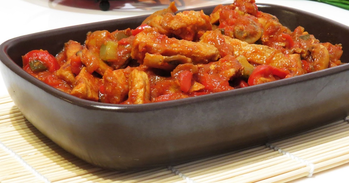 Pyszna pomidorowo-paprykowa kompozycja z kawałkami podsmażonego schabu. Wygląda świetnie dzięki różnokolorowej papryce.