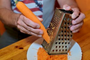 Marchewkę oczyść, zetrzyj i posiekaj drobno pora (można go pominąć). Wszystko przełóż do miski, dodaj sól, miód, ocet jabłkowy i dokładnie wymieszaj.