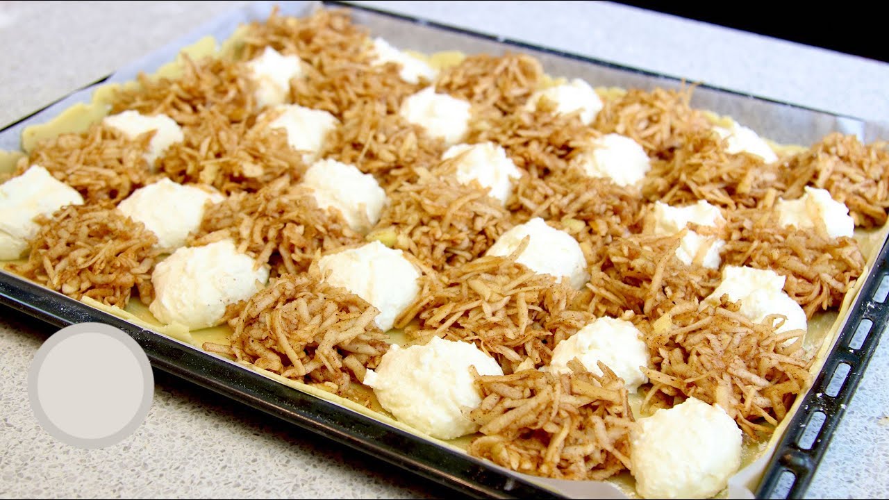 Twarożek wymieszaj ze śmietaną, cukrem i jajkiem. Rozwałkuj ciasto na blaszce do pieczenia, ułóż na nim naprzemiennie za pomocą łyżki stare jabłka i nadzienie serowe.