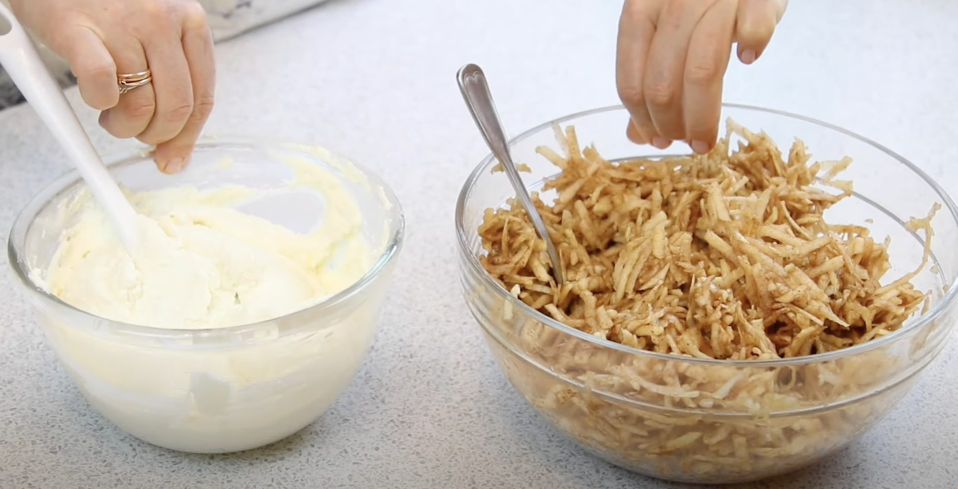 Rozwałkuj połowę na posypanym mąką papierze do pieczenia. Przygotuj nadzienie – zetrzyj jabłka, dopraw wanilią i cynamonem.