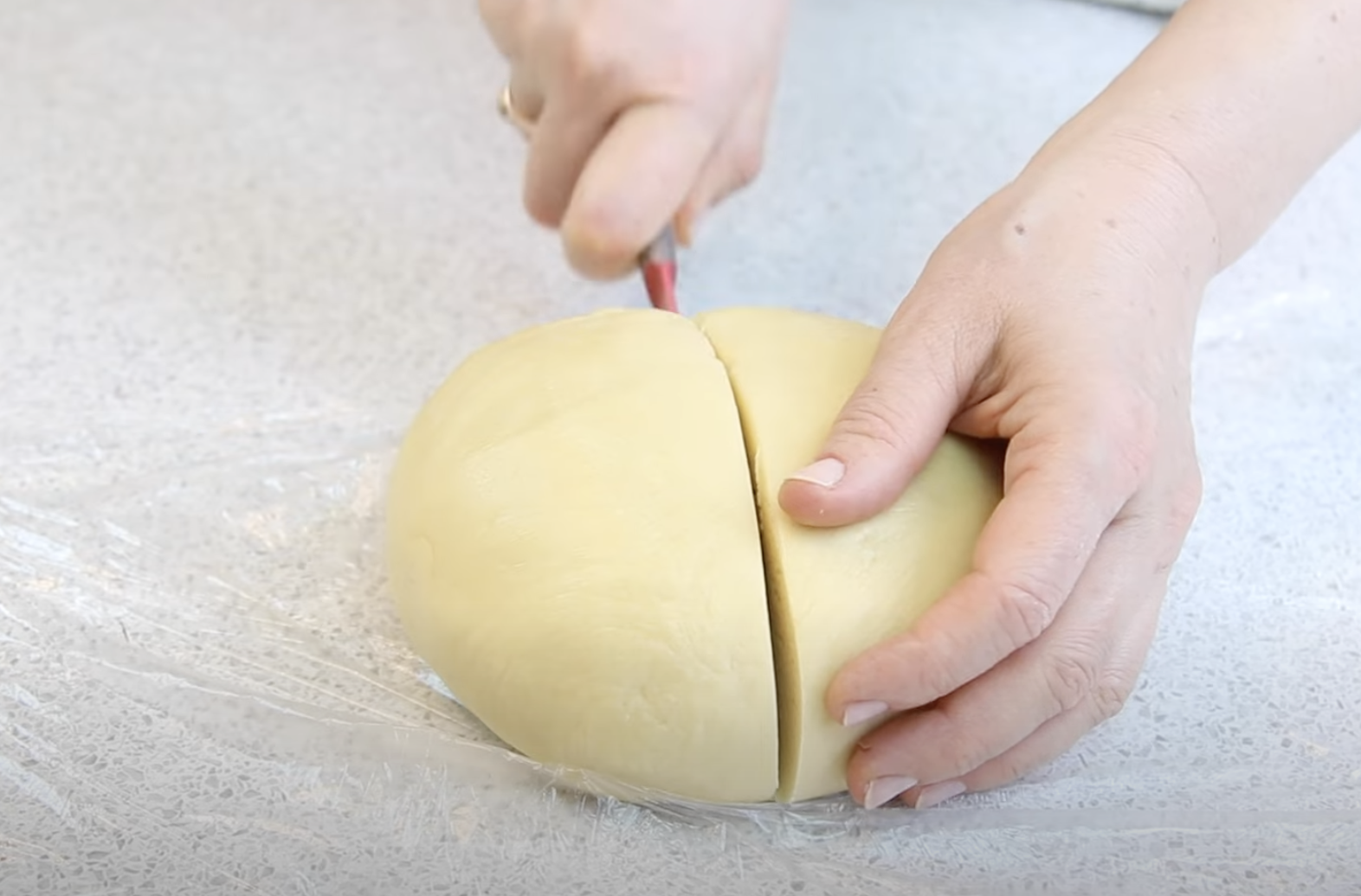 Dodaj 2 jajka, sól, proszek do pieczenia i na koniec stopniowo mąkę. Wyrób gładkie ciasto. Zawiń je w folię i przechowuj w lodówce przez około 40 minut. Następnie podziel je na pół.