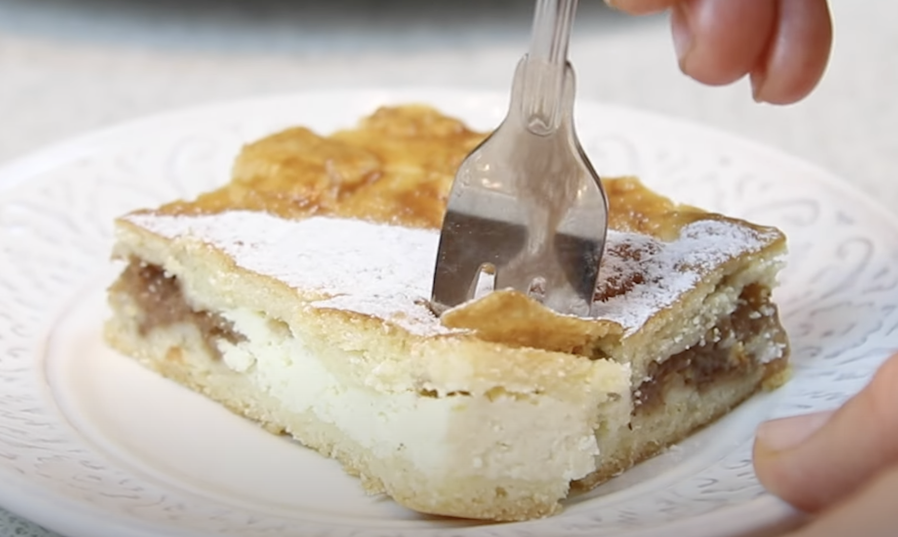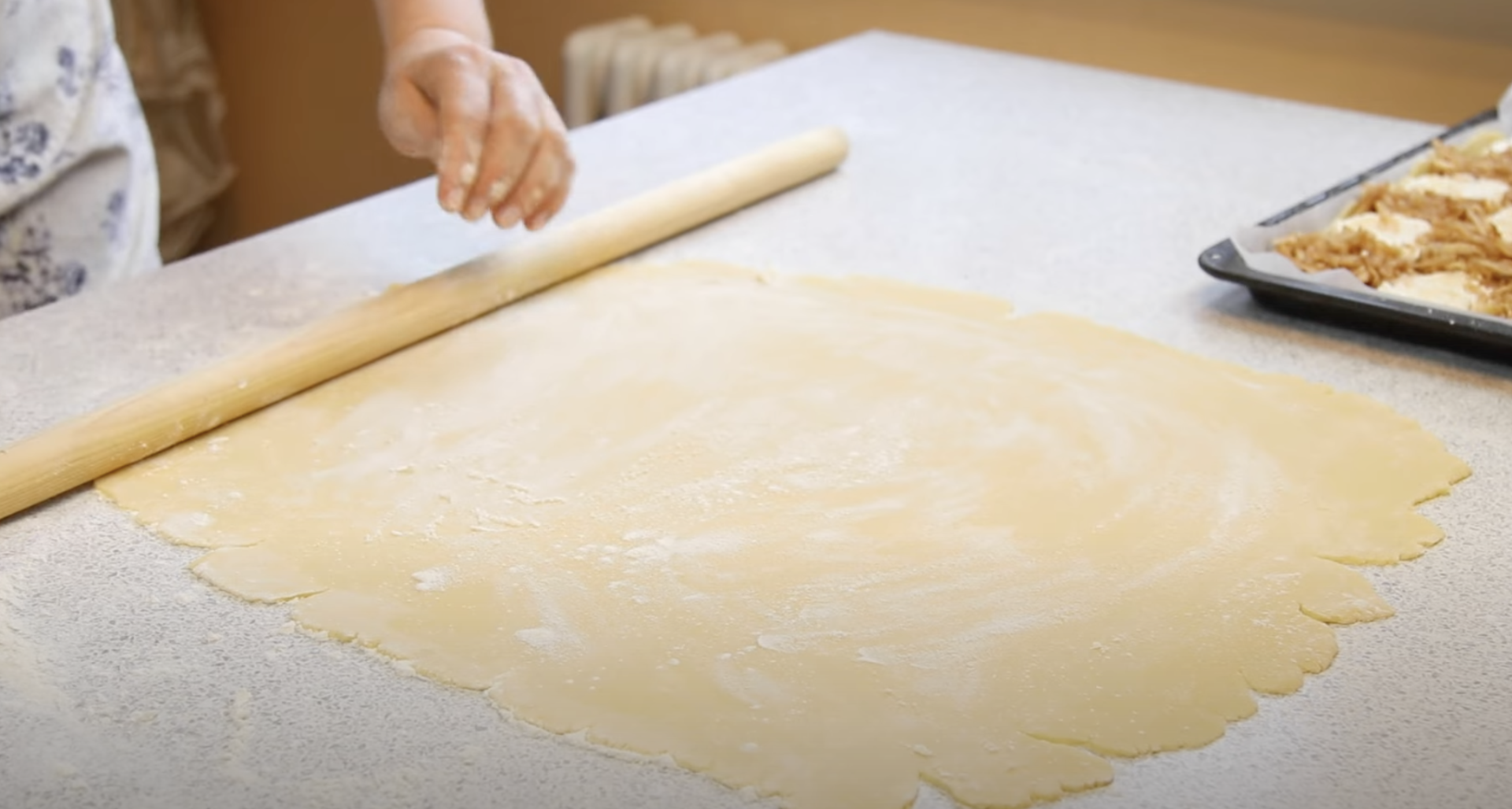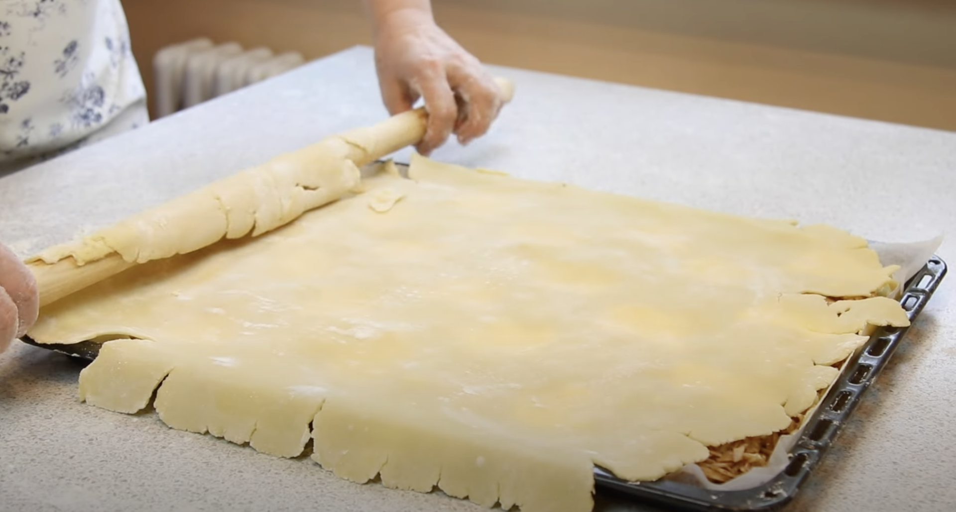 Drugie ciasto rozwałkuj również na posypanej mąką powierzchni i ostrożnie ułóż je na nadzieniu.