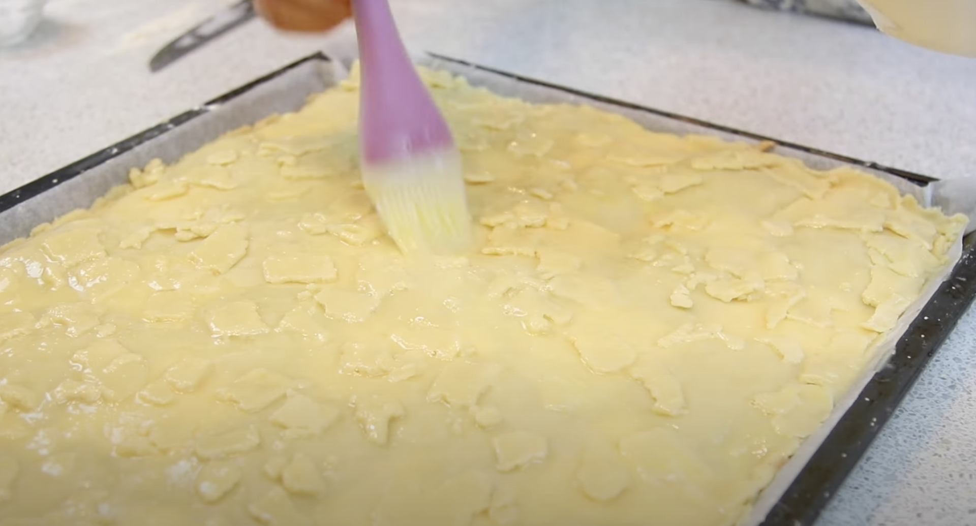 Odetnij brzegi ciasta tak, aby nie wystawały spoza blachy do pieczenia i połóż je pokrojone na wierzchu ciasta. Nakłuj ciasto widelcem.