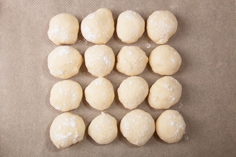 Z otrzymanej masy przygotuj średniej wielkości kulki. Każdą z nich oprósz mąką. Możesz je lekko rozgnieść dłonią, nadając kształt placuszka
