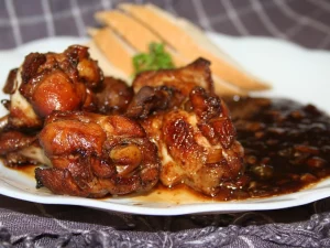 Na patelni rozgrzej oliwę (najlepiej metalową, żeby można było ją później wstawić do piekarnika), włóż odsączone skrzydełka, podsmaż je ze wszystkich stron, dodaj cebulę i czosnek, podsmaż i polej pozostałym sosem sojowym z miskę i taką ilość wrzącego bulionu z kurczaka, aby mięso było prawie zanurzone. Dodać imbir i cały cynamon i wstawić do piekarnika. Piec 30-40 minut, w trakcie polewania i obracania mięsa.