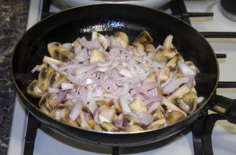 Krok pierwszy – 50 gram masła rozpuść na patelni. Dodaj pokrojoną w paski cebulę oraz pokrojone w duże kawałki pieczarki. Smaż do zarumienienia.
