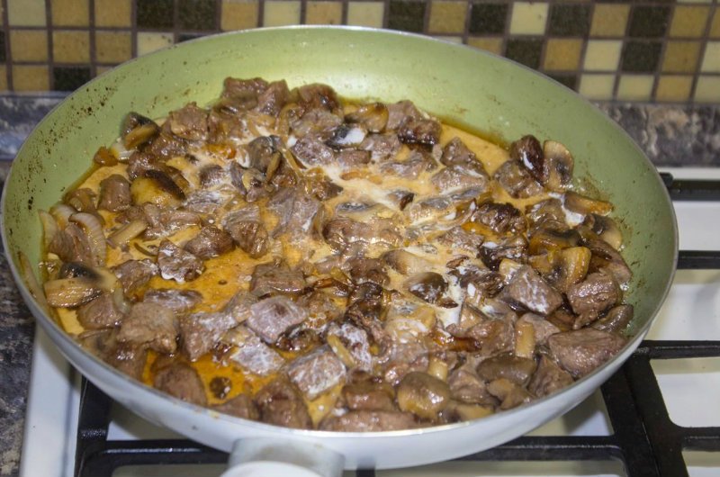 Krok drugi – 600 gram mięsa wołowego pokrój w drobną kostkę i dodaj do podsmażonej cebuli i pieczarek. Podsmaż przez 10 minut. Po tym czasie dodaj wodę, tymianek, koncentrat pomidorowy oraz musztardę. Gotuj przez kolejne 30 minut na średnim ogniu.