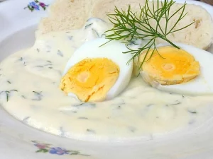 Dodać sól, zagotować i wlać ubitą śmietanę z ubitymi żółtkami. Doprowadź do wrzenia, pozwól mu bulgotać i wyłącz.