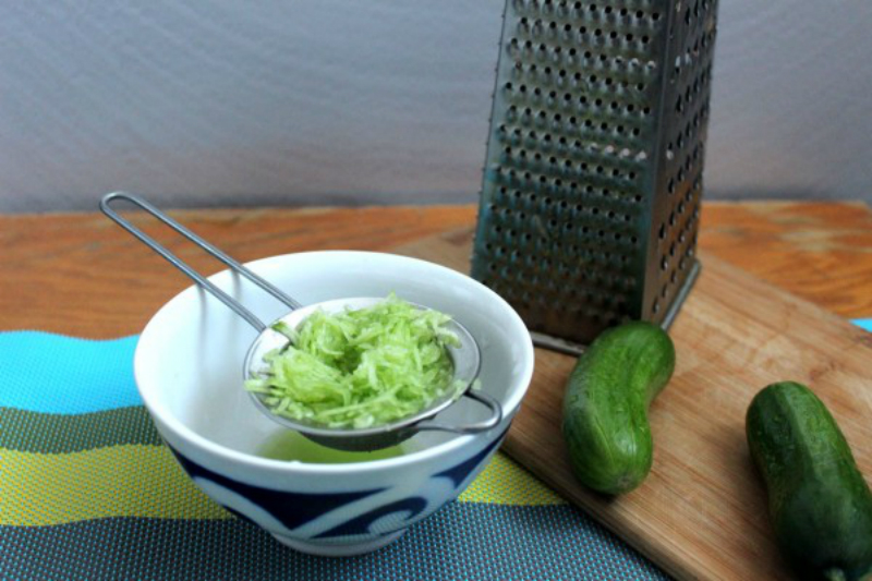 Zetrzyj na małych oczkach tarki pół zimnego ogórka świeżego. Wyciśnij sok i nałóż dużą ilość miąższu na powieki na ok. 20 minut.