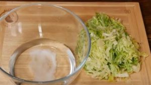Główkę sałaty myjemy pod bieżącą wodą i kroimy w cienkie paski. Do miski wlać wodę i doprawić do smaku solą, cukrem, octem i pieprzem. Dobrze wymieszaj, dodaj posiekaną sałatę i ponownie wymieszaj.