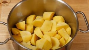 Obierz ziemniaki, pokrój je na mniejsze kawałki i włóż do garnka z wodą. Dopraw je solą i gotuj, aż będą całkowicie miękkie. Następnie odcedź je i dodaj masło. Gdy masło się rozpuści, rozdrobnij je dokładnie za pomocą tłuczka.