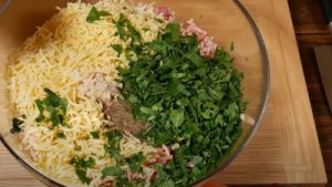 Boczek wieprzowy pokroić w mniejsze plasterki i zmielić za pomocą maszynki do mięsa. Dodać starty ser, doprawić solą, pieprzem i posiekaną świeżą natką pietruszki. Następnie dodać jajko i 100 ml mleka, wszystko dokładnie wymieszać i odstawić masę do lodówki na 30 minut.