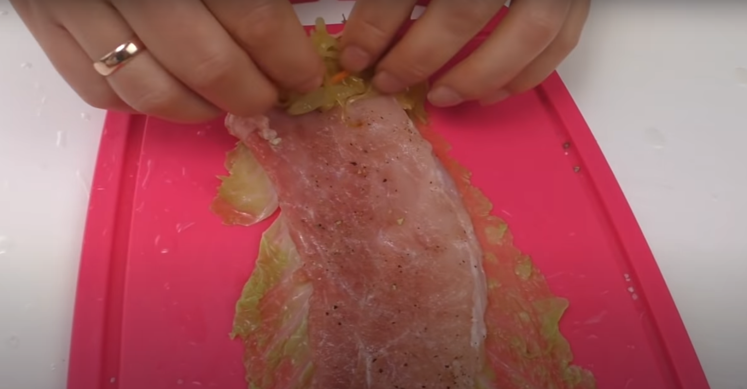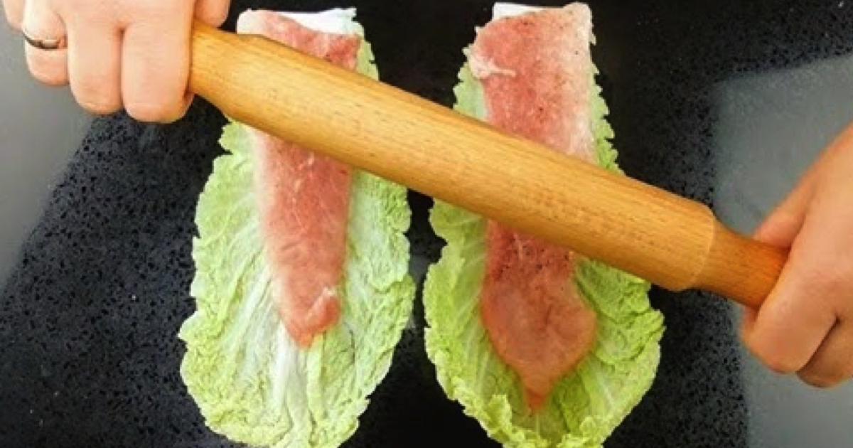 Następnie odcinamy twarde części liści kapusty, które zalewamy wrzątkiem i odstawiamy na 5 minut, aby zmiękły. Po upłynięciu tego czasu, wyjmujemy je i delikatnie osuszamy. Na każdym liściu układamy kawałek mięsa i odrobinę nadzienia marchewkowo-cebulowego.