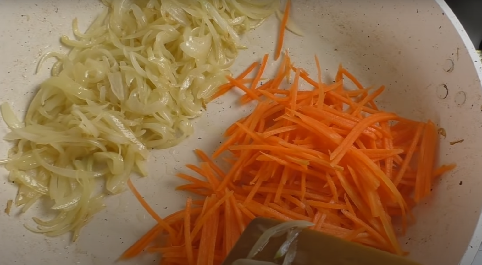 Kroimy cebulę w cienkie paski i podsmażamy na oleju. Marchewkę siekamy i smażymy na tej samej patelni, ale nie mieszamy z cebulą.