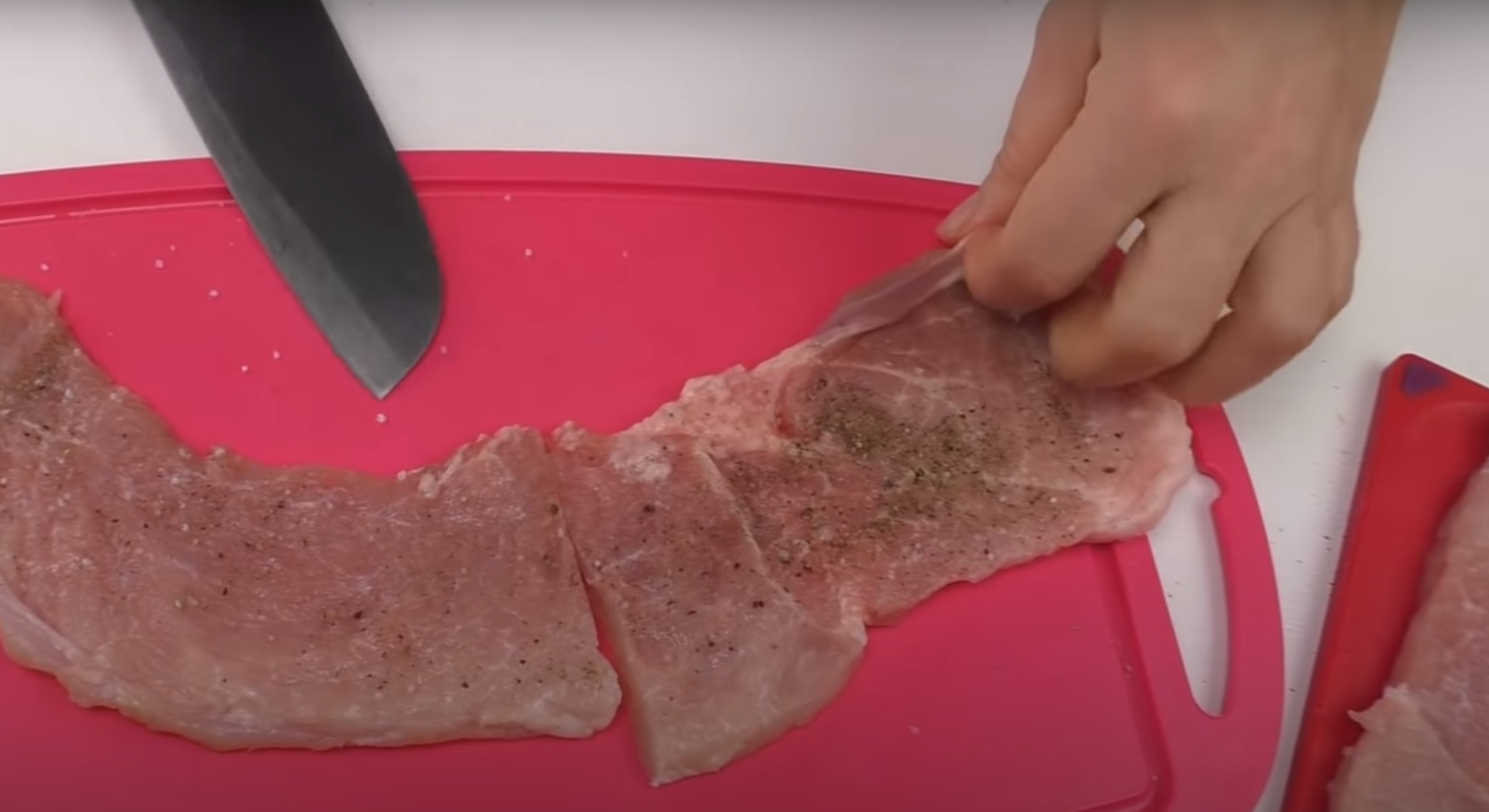 Mięso przykrywamy folią spożywczą i rozbijamy w taki sposób, aby uzyskać długie i stosunkowo cienkie plastry. Z obu stron posypujemy solą i pieprzem.