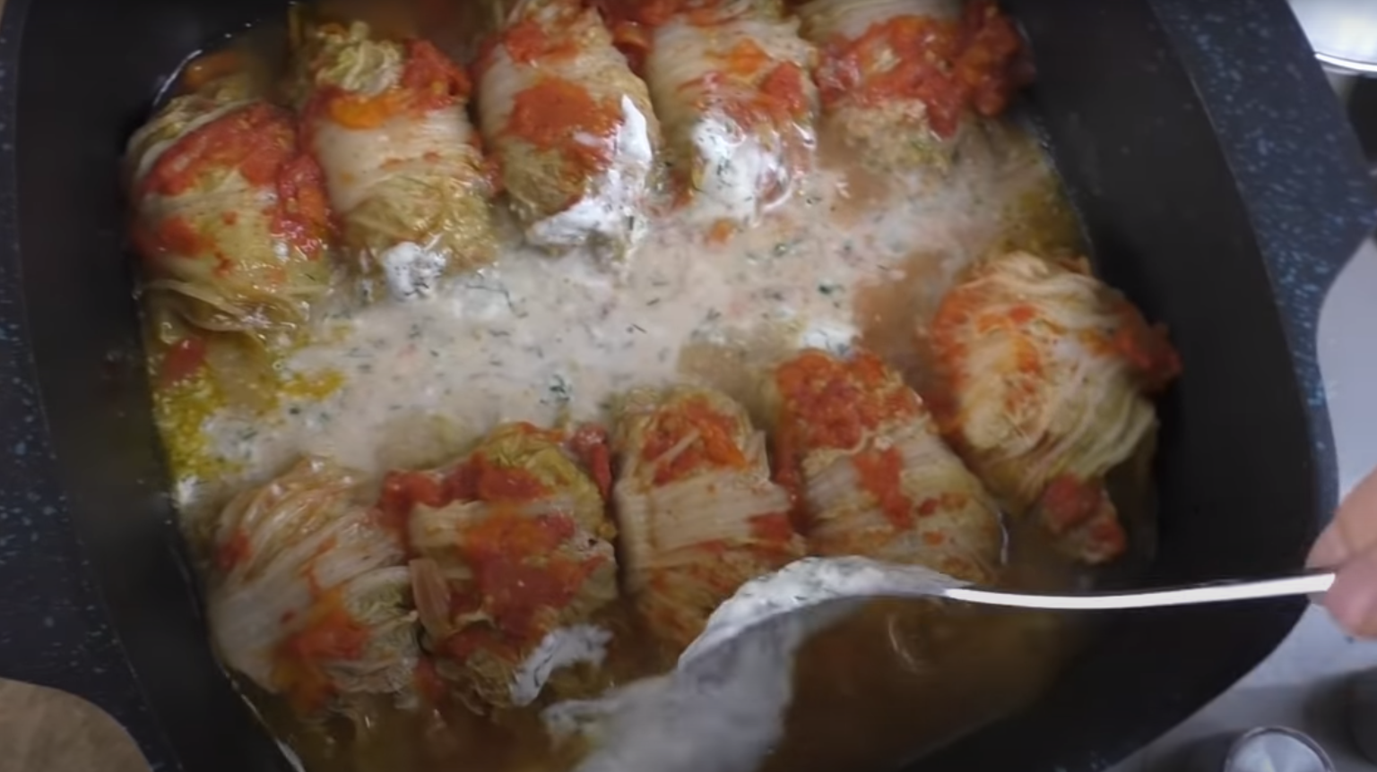 Całość zawijamy w rulon i układamy obok siebie w garnku. Polewamy delikatnie gorącą wodą i uzupełniamy pokrojonymi pomidorami. Przykrywamy pokrywką i gotujemy potrawę na małym ogniu przez około 30 minut.