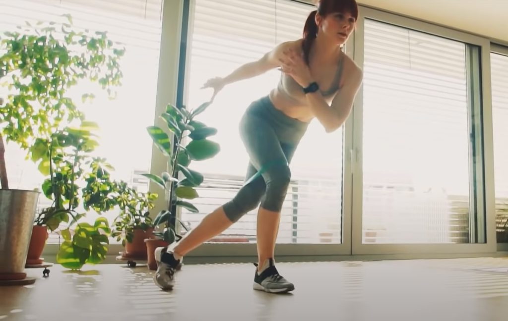 Ćwiczenie to należy wykonywać przez 30 sekund. Do wykonania tego ćwiczenia przydatna jest gumka. Jest ona również wykorzystywana w fitnessie. Podczas wykonywania ćwiczenia umieść gumkę na biodrach.