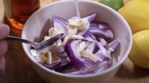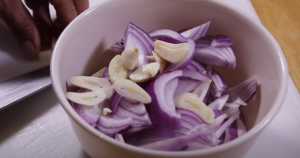 Cebulę oraz czosnek pokrój w paski lub kostkę, a następnie przełóż do miski lub słoika.