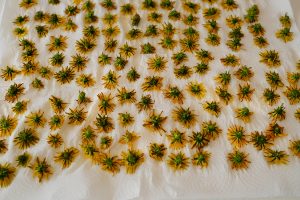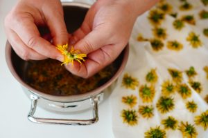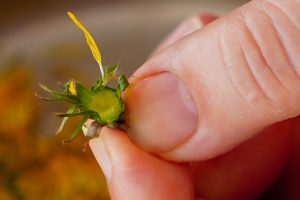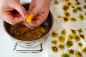 2. Gdy kwiaty są już suche, następuje dość żmudny i czasochłonny proces skubania płatków. Ponieważ zielone koszyczki są gorzkie i mogą zepsuć smak syropu, trzymając za nie, wyrywamy tylko żółte płatki, które są naszym surowcem.