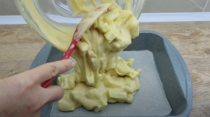 Całość należy ponownie wymieszać do uzyskania jednolitej masy. Wcześniej obrane i pokrojone w kostkę jabłka, należy dodać do całej masy, którą na końcu należy delikatnie rozmieszać.